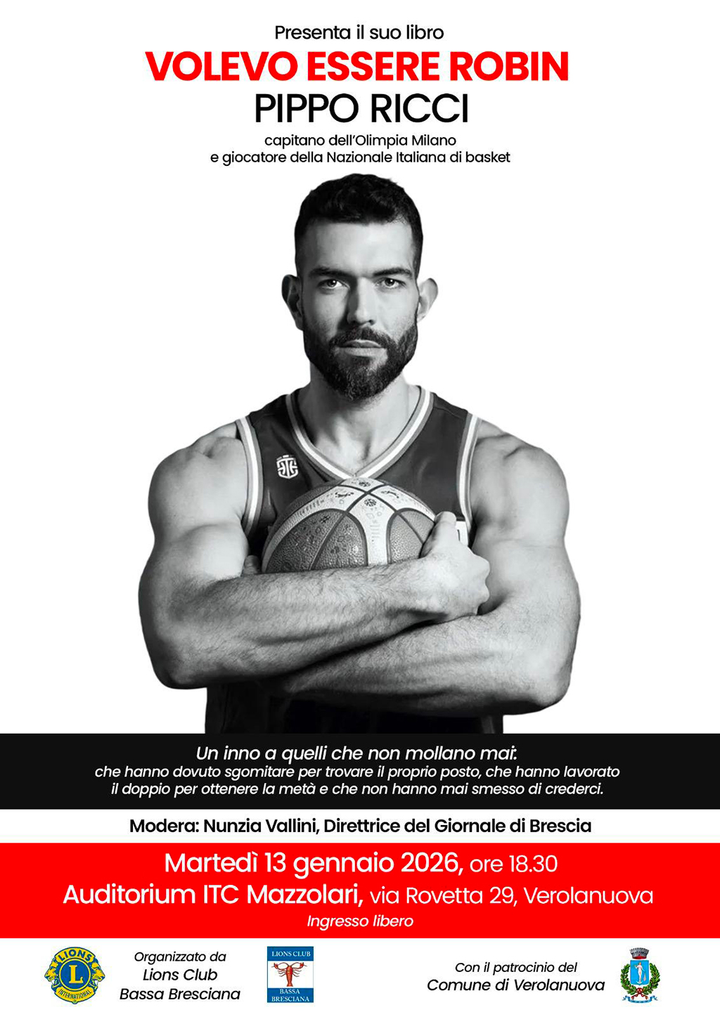 Martedì 13 gennaio ore 18.30, a Verolanuova, Pippo Ricci - capitano dell'Olimpia Milano e giocatore della nazionale italiana di basket - presenta il suo libro "Volevo essere Robin“: un inno a quelli che non mollano mai, che hanno dovuto sgomitare per trovare il proprio posto, che hanno lavorato il doppio per ottenere la metà e che non hanno mai smesso di crederci. Modena Nunzia Vallini, direttore del Giornale di Brescia. Appuntamento all'auditorium ITC Mazzolari di via Rovetta 29 a Verolanuova. A cura del Lions Club Bassa Bresciana, con ingresso libero e patrocinio del Comune.