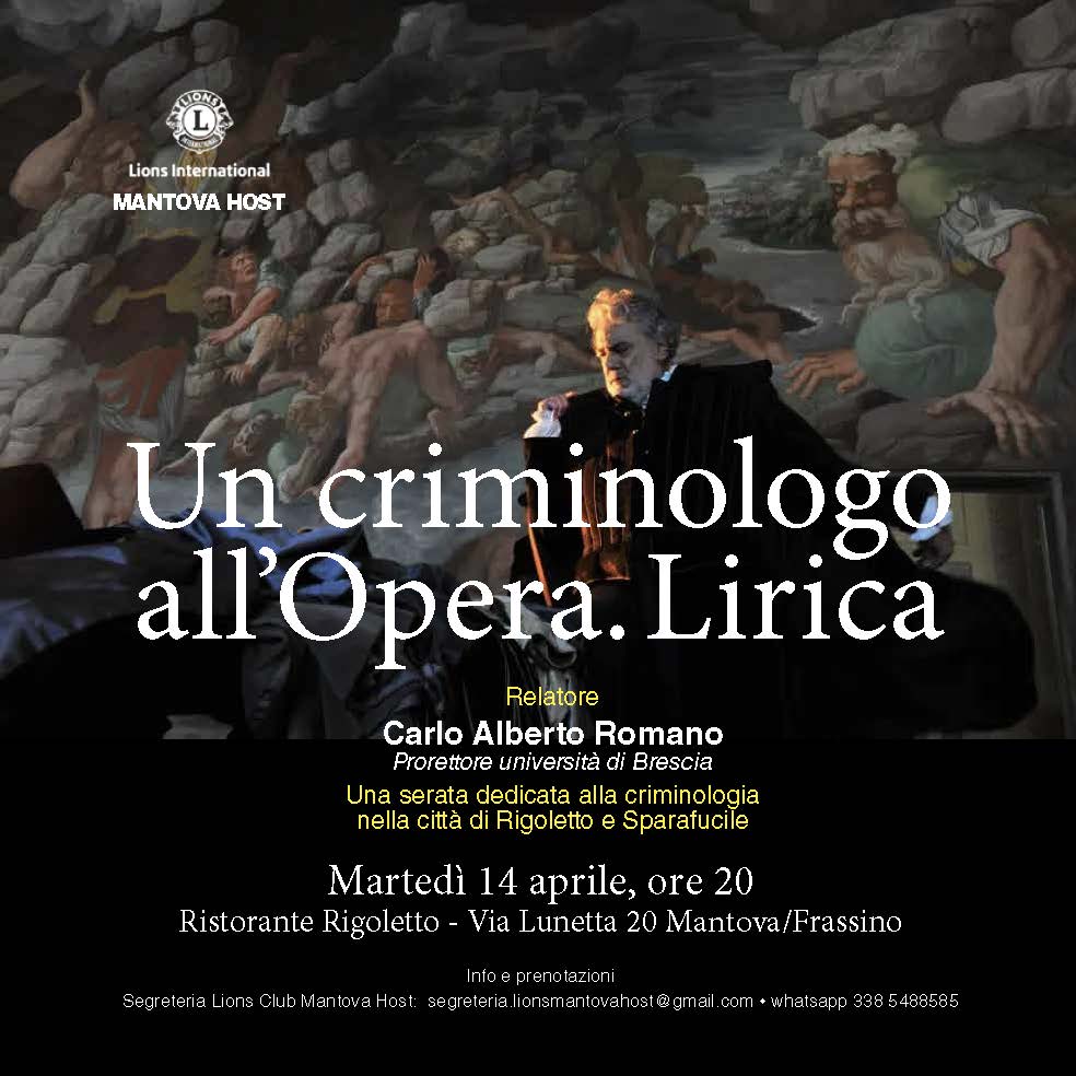 Il Lions Club Mantova Host invita all'incontro "Un criminologo all’Opera. Lirica" che si terrà al Ristorante Rigoletto (via Lunetta 20, Frassino/Mantova) il prossimo 14 aprile, ore 20. Relatore Carlo Alberto Romano, prorettore Università di Brescia, in una serata dedicata alla criminologia nella città di Rigoletto, in una location proprio a due passi dalla verdiana locanda di Sparafucile. Info e prenotazioni: segreteria Lions Club Mantova Host (segreteria.lionsmantovahost@gmail.com • whatsapp 338 5488585). Costo per gli ospiti 40 euro.