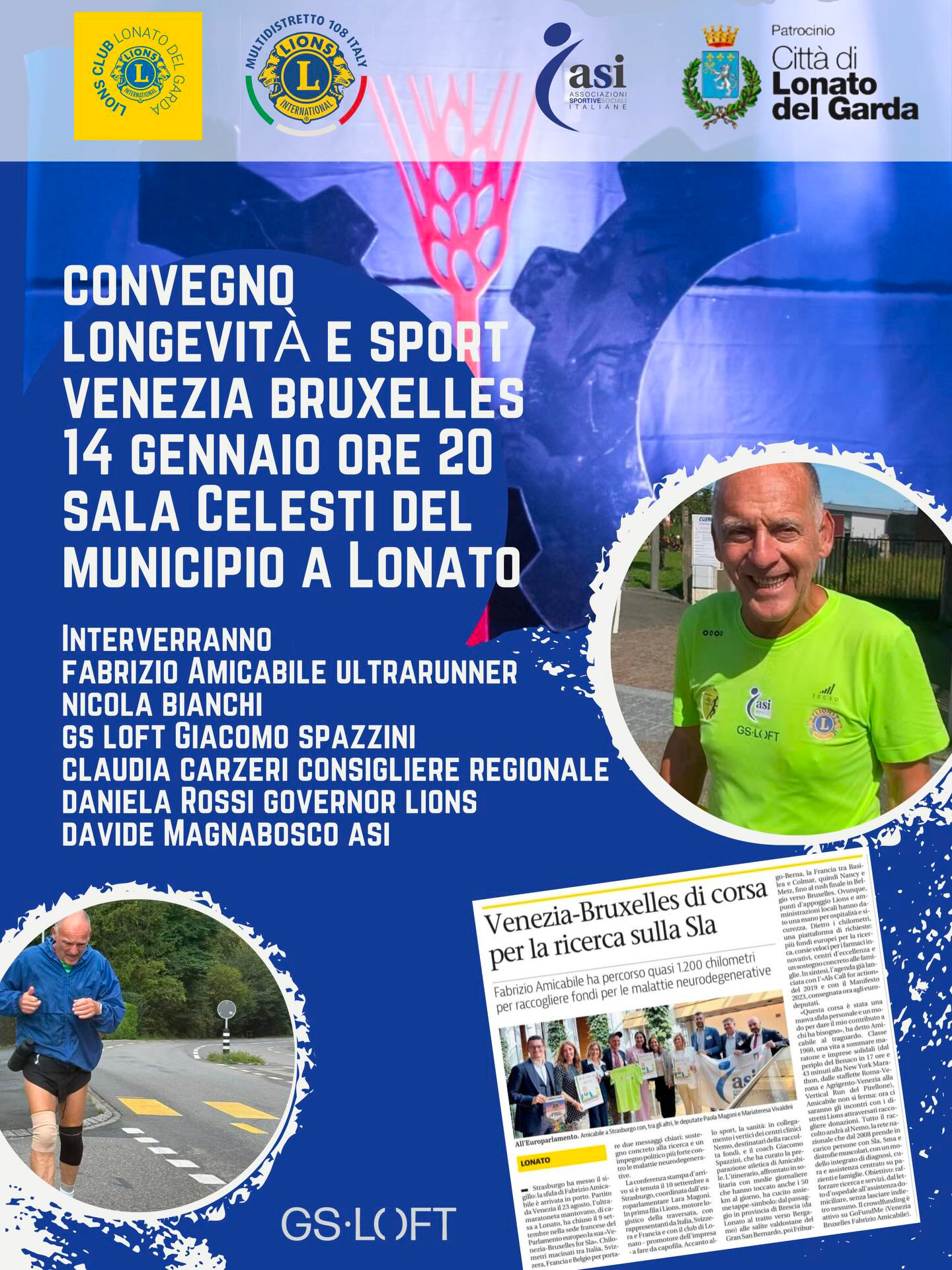Il 14 gennaio alle ore 20 alla Sala Celesti di Lonato un convegno Lions sull’importanza dello sport in funzione della longevità, con un resoconto sull’impresa di Fabrizio Amicabile: la maratona Venezia Bruxelles for SLA 2025. Intervengono il nostro ultrarunner solidale (e socio del LC Lonato del Garda) Fabrizio Amicabile, Nicola Bianchi, Giacomo Spazzini per GS Soft, il consigliere regionale (e Lion) Claudia Carzeri, il DG Daniela Rossi e Davide Magnabosco per ASI. A cura del LC Lonato con il patrocinio del MD Lions 108 Italy, ASI e Città di Lonato: tutto il Distretto è invitato...