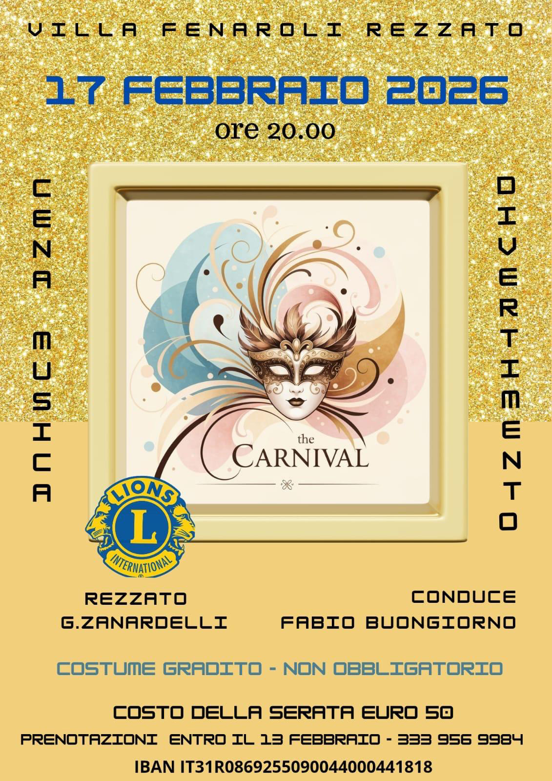 A Villa Fenaroli di Rezzato il 17 febbraio, alle ore 20.00, cena musica e divertimento con la tradizionale serata di Carnevale a cura del Lions Club Rezzato Zanardelli. Conduce Fabio Bongiorno. Costume gradito ma non obbligatorio; costo della serata 50 euro con prenotazioni entro il 13 febbraio al 333 9569984.