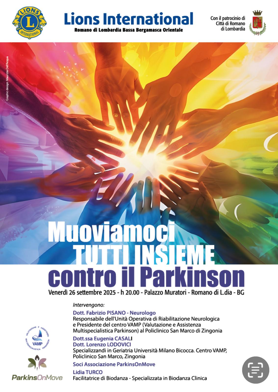 Lions International, LC Romano di Lombardia Bassa Bergamasca Orientale, con il patrocinio della Città di Romano di Lombardia, organizzano per venerdì 26 settembre (ore 20) a Palazzo Muratori un evento dal titolo "Muoviamoci tutti insieme contro il Parkinson". Intervengono Fabrizio Pisano, Eugenia Casali, Lorenzo Lodovici e Lidia Turco. Altri particolari in locandina.