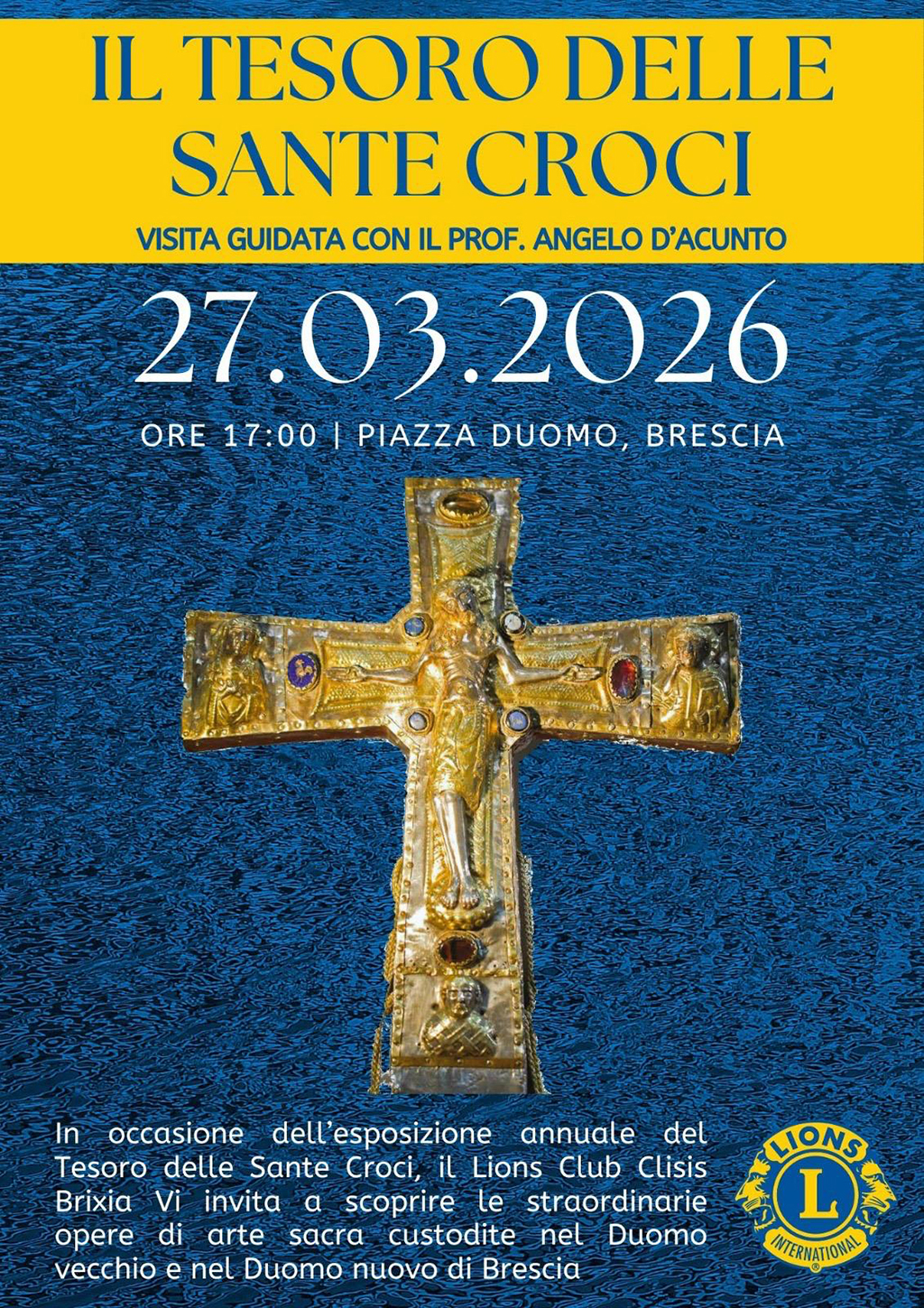 In occasione dell'esposizione annuale del Tesoro delle Sante Croci, il Lions Club Clisis Brixia ci invita a scoprire le straordinarie opere di arte sacra custodite nel Duomo vecchio e nel Duomo nuovo di Brescia. Appuntamento il 27 marzo alle ore 17 in Piazza Duomo a Brescia, per una visita guidata con il prof. Angelo d'Acunto