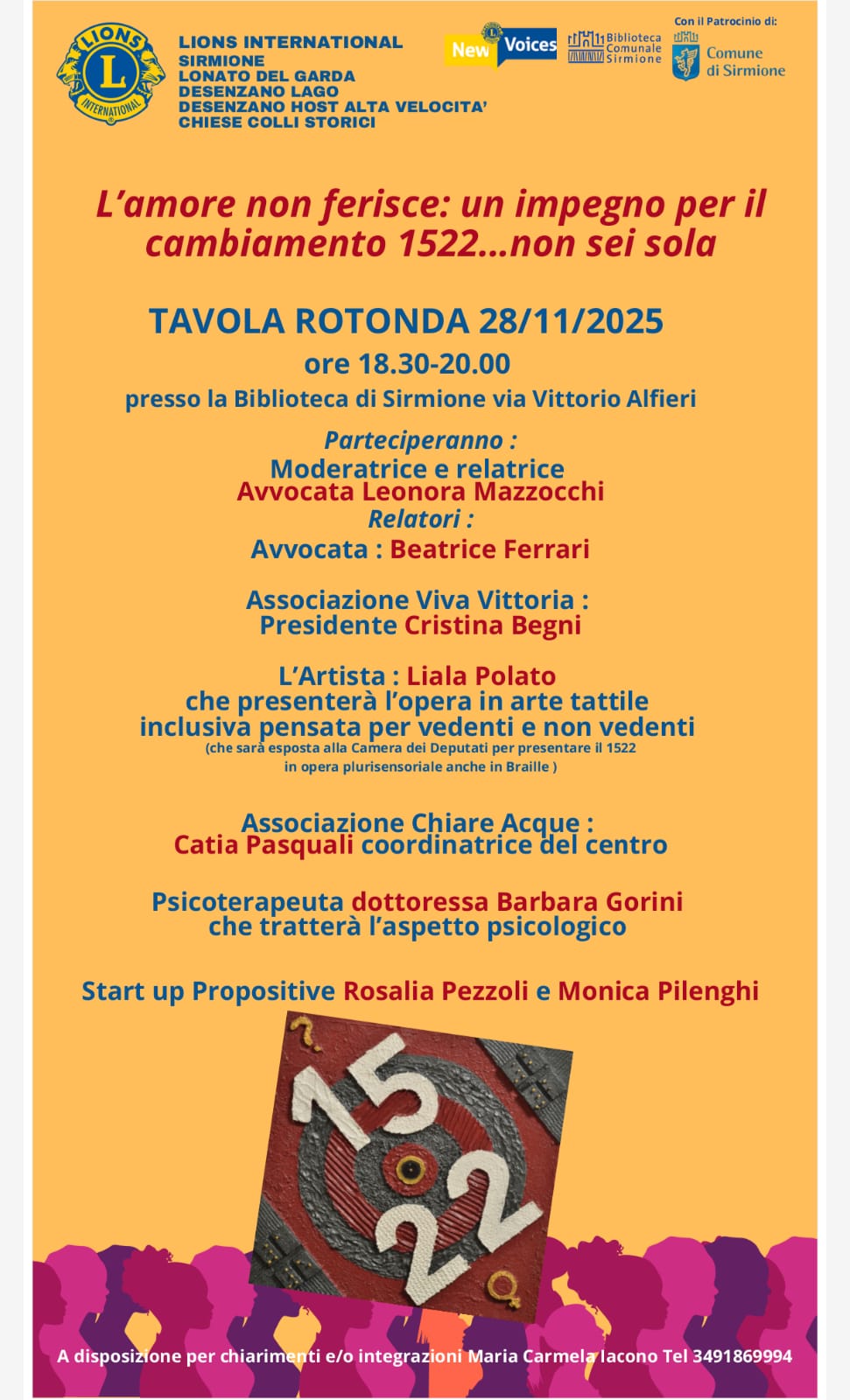 28 novembre, tavola rotonda a Sirmione su "L'amore che non ferisce" e il telefono antiviolenza 1522 con Beatrice Ferrari, avvocato; Cristina Begni, presidente Associazione Viva Vittoria; l'artista Liala Polato; Catia Pasquali per l'Associazione Chiare Acque; Barbara Gorini, pricoterapeuta; Rosalia Pezzoli e Monica Pilenghi per Start Up Propositive. Modera l'avv. Leonora Mazzocchi. Alla Biblioteca civica di via Vittorio Alfieri dalle 18.30 alle 20. A cura dei LC Sirmione, Lonato del Garda, Desenzano Host, Desenzano Alta Velocità e Chiese Colli Storici. Info: Carmela Iacono.