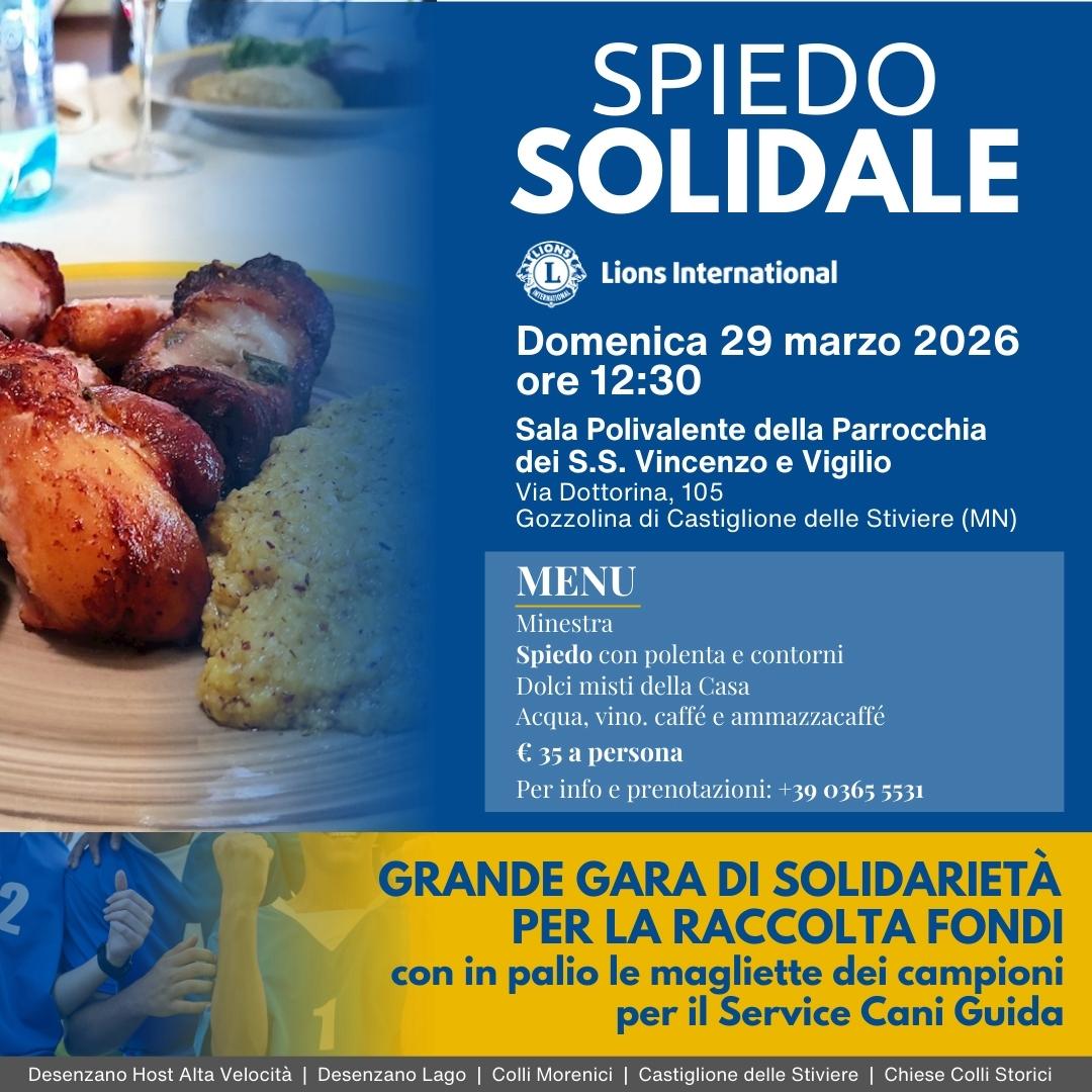 Spiedo solidale domenica 29 marzo alle ore 12.30 alla sala polivalente della Parrocchia dei S. S. Vincenzo e Virgilio in via Dottorina 105 a Gozzolina di Castiglione delle Stiviere. Menu: minestra, spiedo con polenta e contorni, dolci misti della casa, acqua, vino, caffè e ammazzacaffè per 35 euro a persona. Info e prenotazioni 0365 5531. In palio anche le magliette dei campioni, per una grande gara di solidarietà finalizzata alla raccolta fondi per il service Cani guida. A cura dei LC Desenzano Host Alta Velocità, Desenzano Lago, Colli Morenici, Castiglione delle Stiviere, Chiese Colli Storici