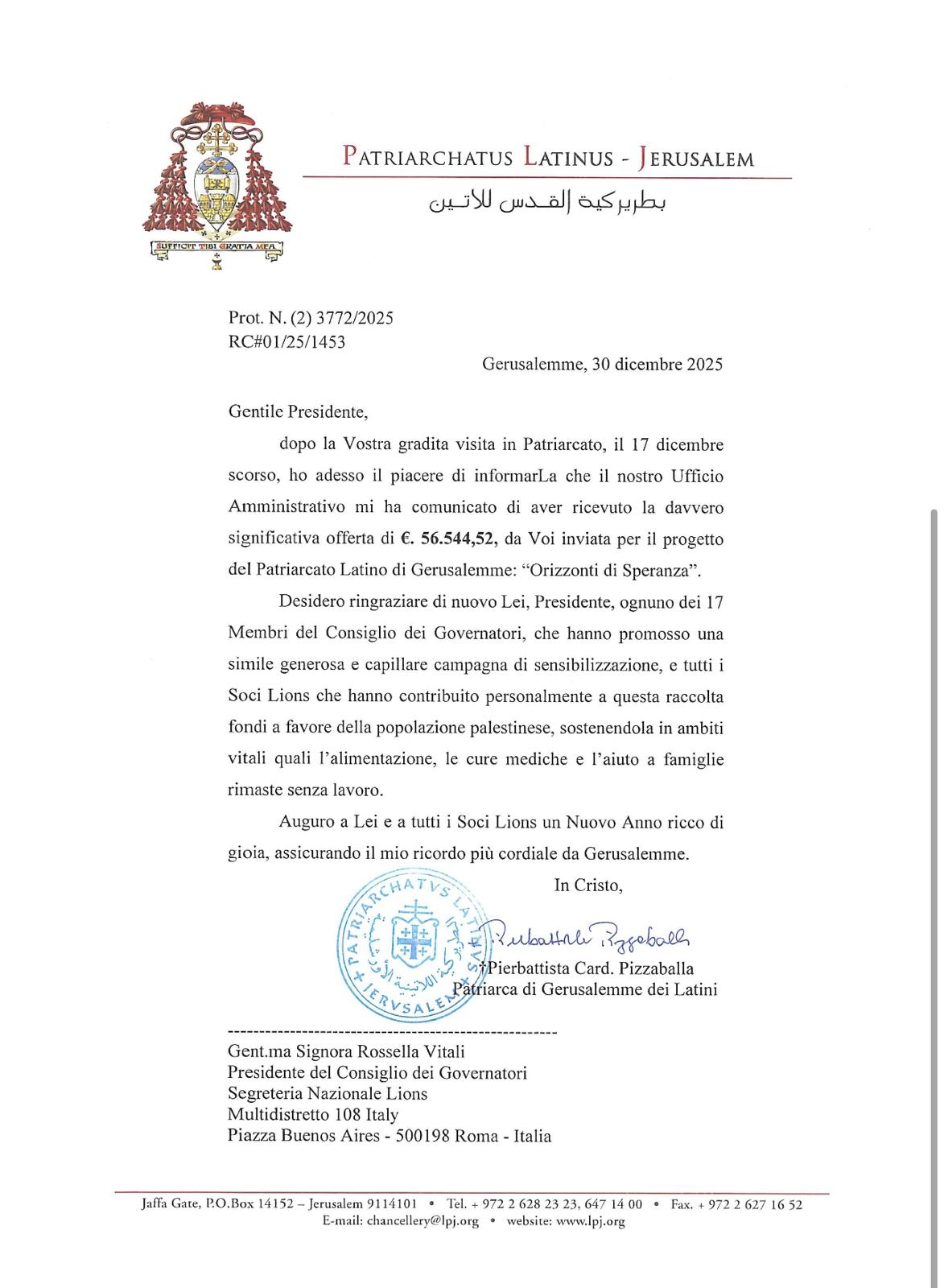 In una lettera ufficiale indirizzata al presidente del Consiglio dei Governatori, il cardinale Pizzaballa - patriarca di Gerusalemme dei Latini - comunica di aver ricevuto la somma di 56.544, 53 euro della nostra raccolta. Ringrazia i governatori "che hanno promosso una simile generosa e capillare campagna di sensibilizzazione, e tutti i soci Lions che hanno contribuito personalmente a questa raccolta fondi a favore della popolazione palestinese, sostenendola in ambiti vitali quali l'alimentazione, le cure mediche e l'aiuto a famiglie rimasta senza lavoro".