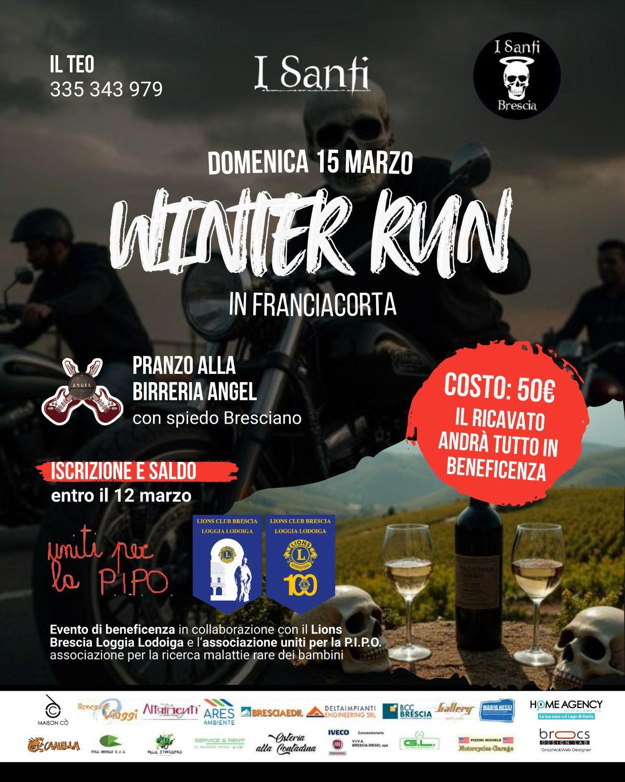 Domenica 15 marzo "Winter Run" in Franciacorta. A seguire, pranzo alla birreria Ángel con spiedo bresciano: costo 50 euro. Il ricavato andrà tutto in beneficenza. Iscrizione e saldo entro il 12 marzo (Teo 335 343979). Evento di beneficenza in collaborazione con il Lions Club Brescia Loggia Lodoiga e l'associazione uniti per la PIPO, associazione ricerca malattie rare dei bambini.