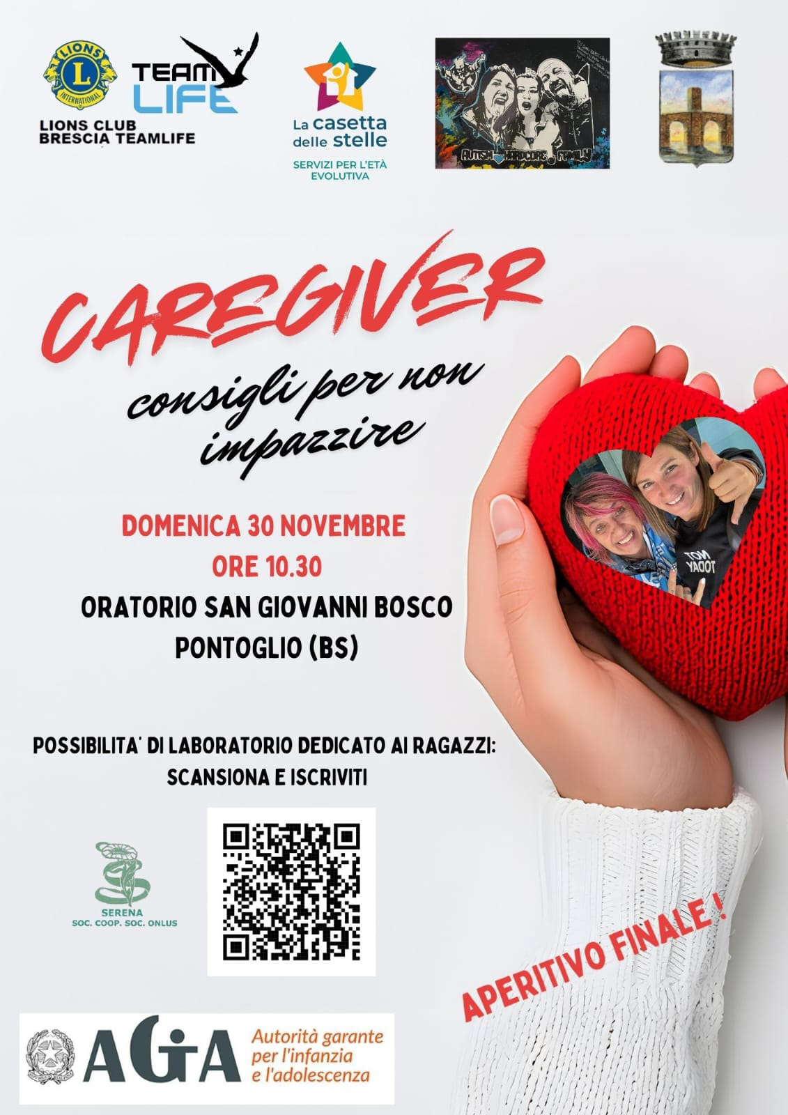 "Caregiver, consigli per non impazzire" è l'evento organizzato dal Lions Club Brescia Teamlife all'Oratorio San Giovanni Bosco di Pontoglio (BS). Appuntamento domenica 30 novembre alle 10.30 per una grande giornata, che prevede anche un laboratorio dedicato ai ragazzi fragili, realizzata in collaborazione con la Casetta delle Stelle, Autism Hardcore Family, Coop. Serena e Comune di Pontoglio, con il patrocinio di AGA, Autorità Garante per l'infanzia e l'adolescenza.
