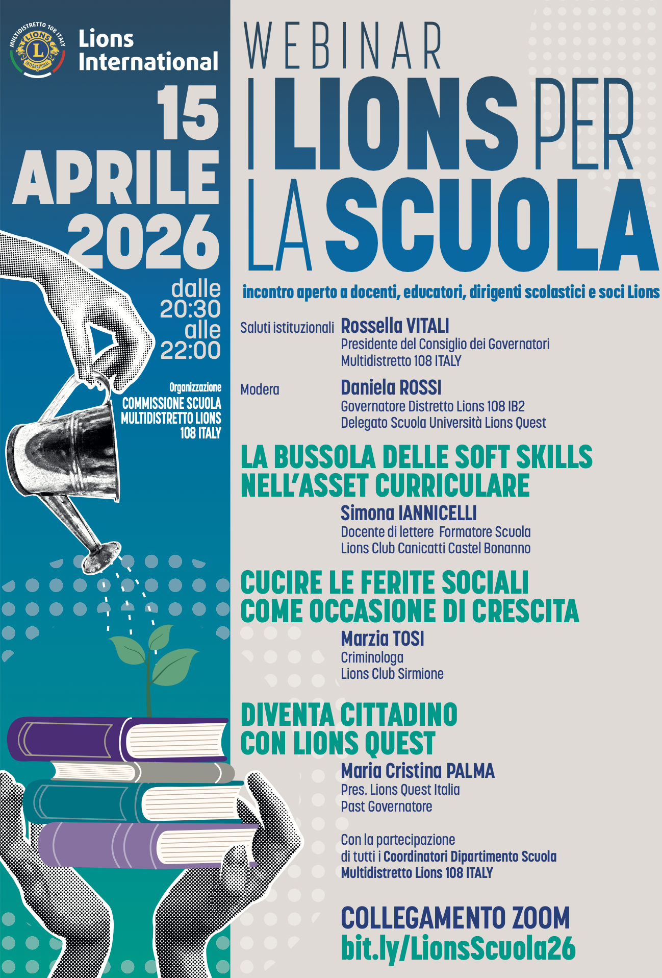 Il 15 aprile dalle 20.30 alle 22 siamo tutti invitati a portare riflessioni e contributi su Lions e Scuola all'interno del webinar multidistrettuale "I Lions per la scuola": un incontro aperto a docenti, educatori, dirigenti scolastici e soci Lions. Introduzione a cura di Rossella Vitali, presidente Consiglio dei Governatori del multidistretto 108 Italy; interventi di Simona Iannicelli, docente di lettere e formatore Scuola ("La bussola delle soft skills nell'asset curriculare"); Marzia Tosi, criminologa del Lions Club Sirmione ("Cucire le ferite sociali come occasione di crescita); la PDG Maria Cristina Palma, presidente Lions Quest Italia ("Diventa cittadino con Lions Quest); modera il nostro DG Daniela Rossi, delegato del MD Scuola Università Lions Quest.
