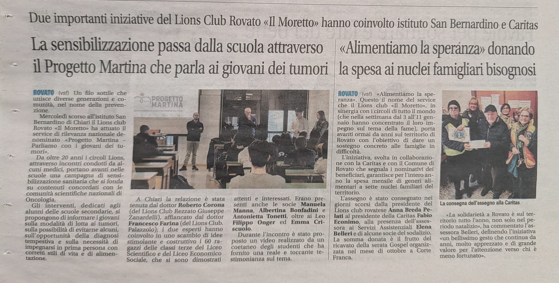 Mercoledì 14 presso l’Istituto San Bernardino di Chiari il LC “Rovato il Moretto” ha attuato il service di rilevanza nazionale “Progetto Martina: parliamo con i giovani di tumori”. La relazione è stata tenuta dal dott. Roberto Corona (socio del LC Rezzato Giuseppe Zanardelli) che, coadiuvato dal dott. Francesco Farina (socio del LC Palazzolo), ha coinvolto in uno scambio di idee stimolante e costruttivo i 60 ragazzi delle classi 3^ del Liceo Scientifico e del Liceo Economico Sociale. Presenti anche le socie Manuela Manna, Albertina Bonfadini e Antonietta Tonetti con i Leo Filippo Onger ed Emma Criscuolo. Gli studenti si sono dimostrati attenti, interessati e particolarmente colpiti anche dal video realizzato da un loro coetaneo che ha fornito una reale e toccante testimonianza.