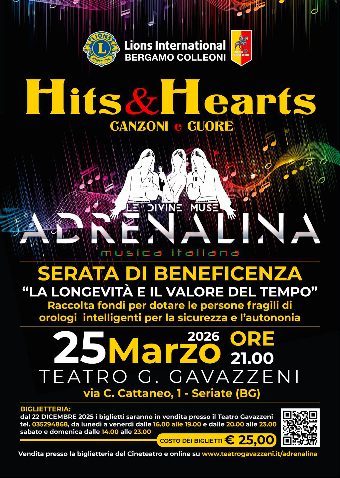 Scegliere “Hits & Hearts – Canzoni e Cuore” non significa solo regalarsi uno spettacolo di grande musica italiana, ma sostenere un progetto di valore profondo, concreto, necessario. Il Lions Club Bergamo Colleoni lavora con dedizione e serietà per trasformare la cultura e lo spettacolo in aiuto reale, e questa serata di beneficenza nasce proprio con l'obiettivo di raccogliere fondi per donare orologi intelligenti a persone fragili, strumenti di sicurezza, autonomia e dignità. Dietro a tutto questo c’è un impegno instancabile, fatto di tempo, cura e responsabilità. Un impegno che i Soci del LC Bergamo Colleoni portano avanti con passione autentica, senza mai risparmiarsi, credendo profondamente nel valore di questa iniziativa e nel bene che può generare. Perché quando la musica incontra il cuore, il bene si moltiplica.
