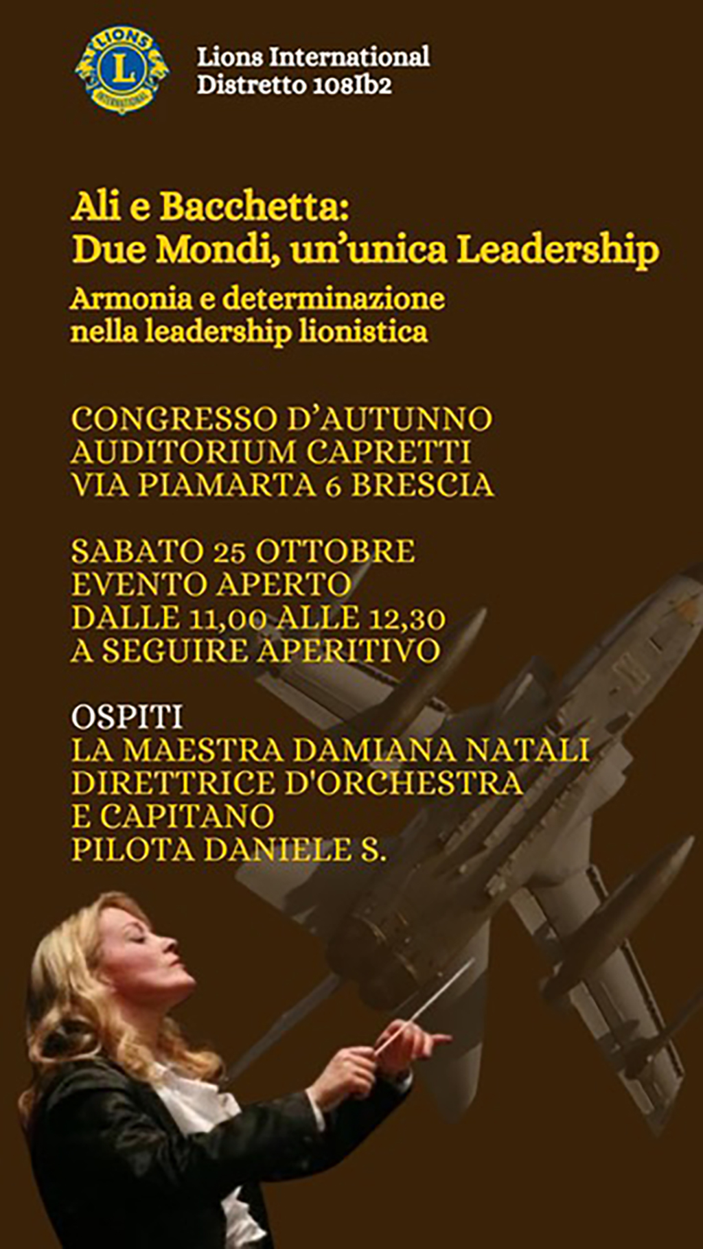 Il 25 ottobre (ore 9.00) si terrà a Brescia, nella consueta sede dell'Auditorium Capretti, il Congresso d'Autunno del nostro Distretto 108IB2, caratterizzato in questa occasione da alcune novità. Ci sarà una prima parte "tradizionale" per l'approvazione dei bilanci, e una seconda parte con due prestigiosi ospiti che ci parleranno della loro esperienza sul tema della leadership: il direttore d'orchestra Damiana Natali e un pilota, il capitano S. Per espressa volontà del Governatore, a partire dalle 11 l'evento si apre a tutti - Lions e non - con l'obiettivo di proporre un argomento utile sia nella vita lionistica che nel lavoro o nella vita privata. Ospiteremo due relatori di spicco che trattano diverse sfaccettature del concetto di leadership finalizzata al raggiungimento di un obiettivo comune. Al termine, spazio per domande e approfondimenti con aperitivo a fine evento.