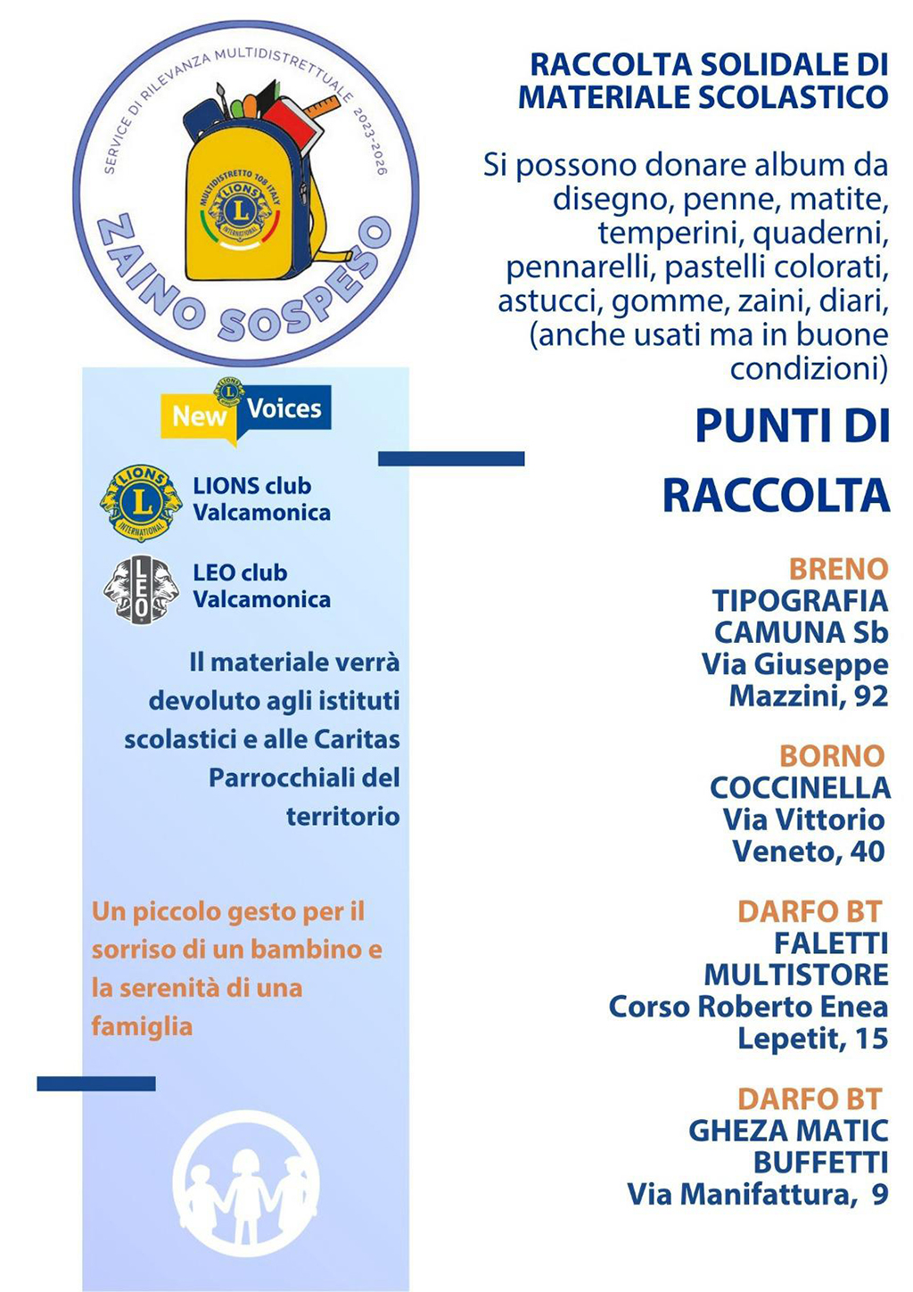 In Valle Camonica parte il progetto «Zaino sospeso»: un piccolo gesto per il sorriso di un bambino e la serenità di una famiglia. Garantire a bambini e ragazzi un corredo scolastico completo, sostenendo così il diritto allo studio anche per chi vive momenti di difficoltà economica: è questo l’obiettivo del progetto, service multidistrettuale promosso da LEO e LIONS Club Valcamonica con il contributo della referente New Voices, Enza Novelli De Michelis.