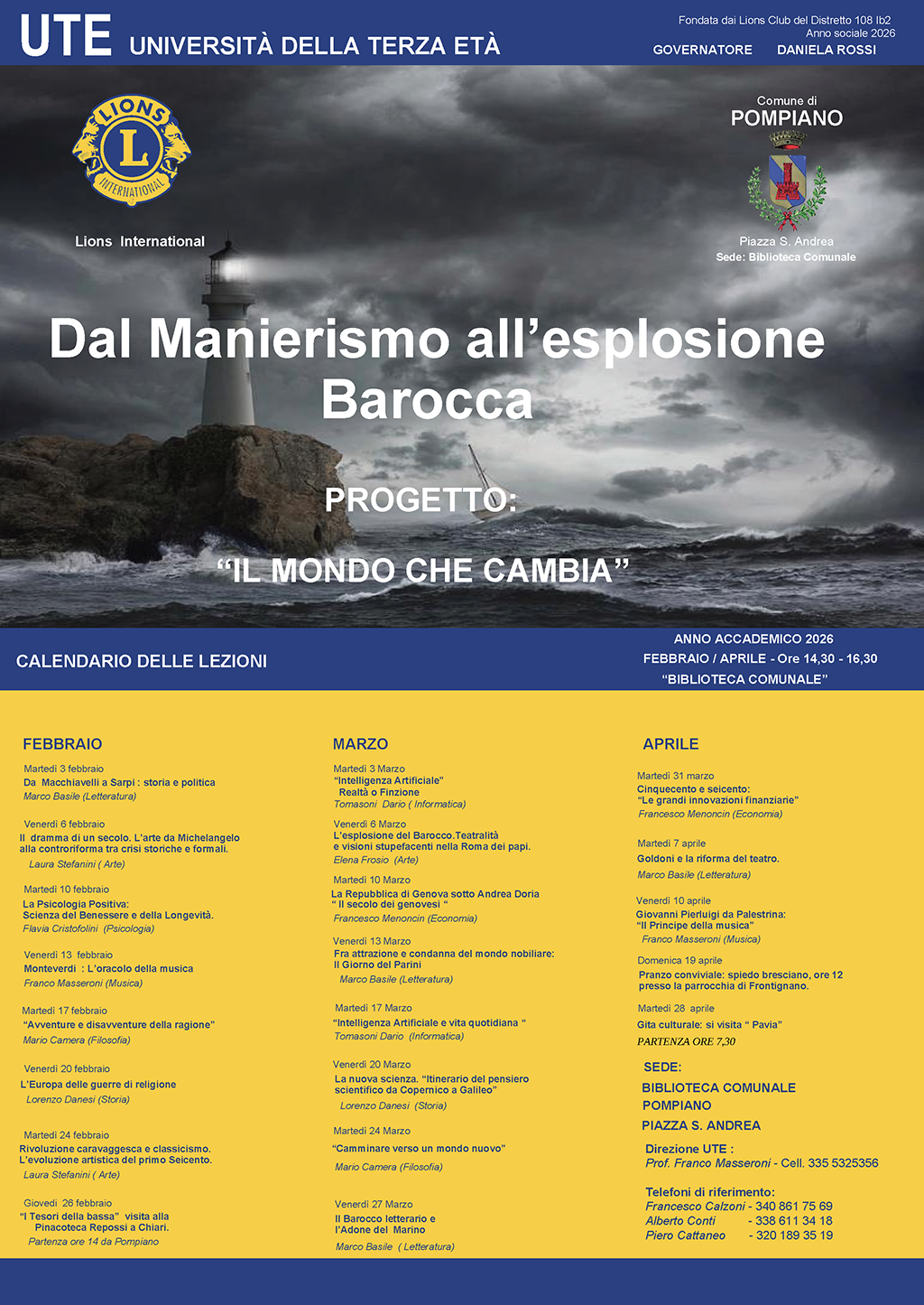 Per la sede di Pompiano, il tema dell'anno accademico 2026 è "Dal Manierismo all'esplosione barocca" nell'ambito del progetto "Il mondo che cambia". Come nella consolidata tradizione dell’Università della Terza Età, attiva dal 2013 sotto l'egida dei Lions bresciani, i nostri relatori affrontano temi storici, culturali e tanti altri argomenti di sicuro interesse. Di seguito il calendario delle lezioni e la relativa brochure con il quadro completo. La versione PDF è scaricabile al bottone blu "Scopri di più" a piè di pagina. Info e costi di adesione: Franco Masseroni, direttore didattico UTE - cell. 335 5325356 fmasseroni@gmail.com