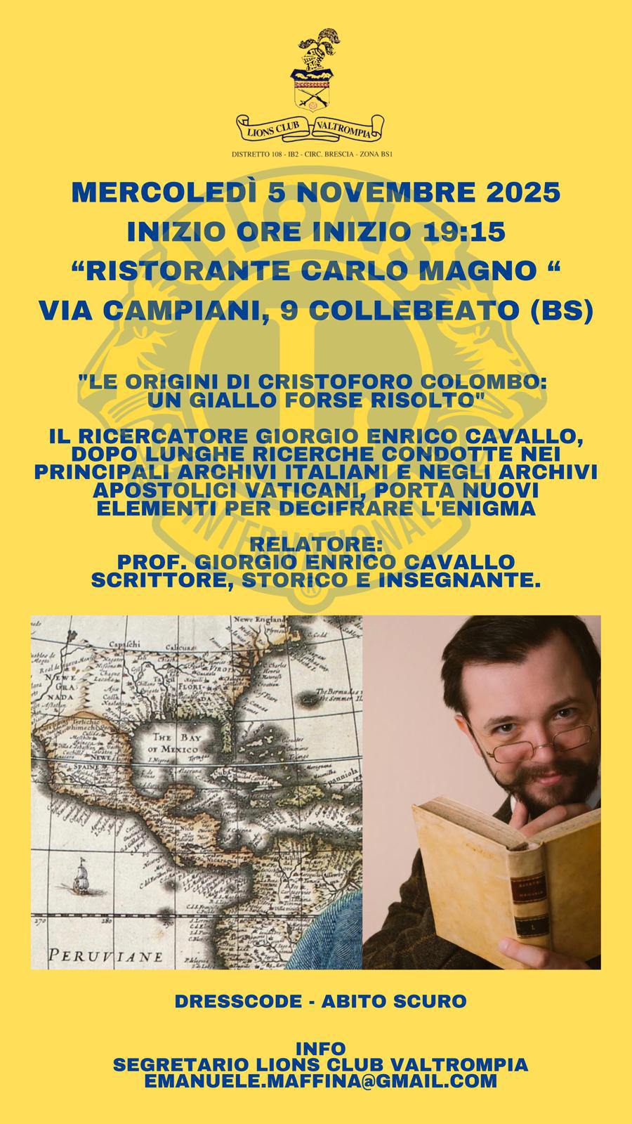 5 novembre, ore 19.15: al ristorante Carlo Magno di Collebeato il prof. Giorgio Enrico Cavallo - storico, scrittore, insegnante - tratterà delle origini di Cristoforo Colombo, condividendo gli esiti delle sue ricerche condotte nei proncipali archivi italiani e apostolici vaticani, evidenziando nuovi elementi per decifrare l'enigma. Dress code: abito scuro. Info e prenotazioni: emanuele.maffina@gmail.com