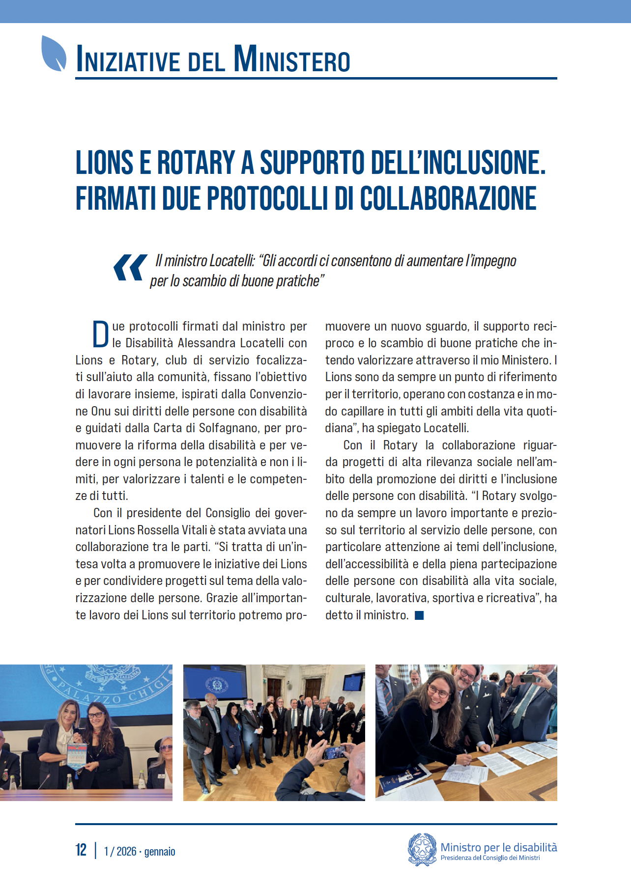 Il nostro DG evidenzia il lavoro che a livello nazionale si sta portando avanti sul tema della disabilità. Sul nuovo periodico del Ministero della Salute ("Io valgo - 1/26) èun articolo presenta i protocolli firmati con il ministro per la Disabilità Alessandra Locatelli, da anni grande ammica dei Lions. Il ministro, nell'occasione: “Gli accordi ci consentono di aumentare l’impegno per lo scambio di buone pratiche”.