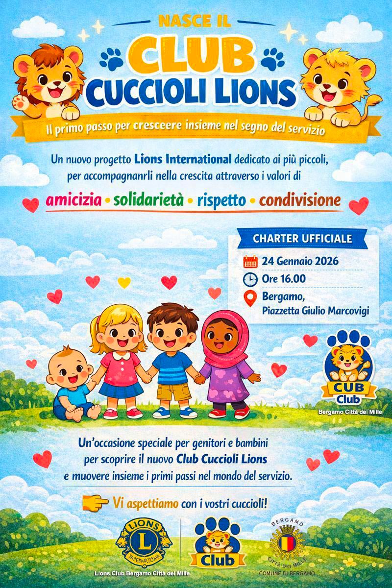 Su iniziativa del LC Bergamo Città dei Mille nasce a Bergamo il primo Cub Club (Club Cuccioli)! Un primo passo per crescere insieme nel sede del servizio... Il nostro Distretto accoglie dunque il nuovo progetto Lions International dedicato al più piccoli, per accompagnarli nella crescita attraverso i valori di amicizia, solidarietà, rispetto e condivisione. La Charter ufficiale è in programma il 24 gennaio alle 16 in piazzetta Giulio Marcovigi, con il patrocinio del Comune: un'occasione speciale rivolta a genitori e bambini per scoprire il nuovo Club Cuccioli Lions e muovere insieme i primi passi nel mondo del servizio. Il Lions Club Bergamo Città dei Mille aspetta genitori e bambini per festeggiare insieme, Lions e non!