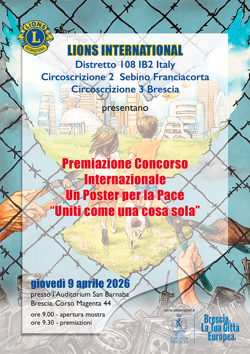 La referente distrettuale Luisa Boglioni ci invita alla cerimonia di Premiazione del XXXVIII Concorso Internazionale “Un Poster per la Pace” che quest’anno aveva come titolo “Uniti come una cosa sola”: l’appuntamento è per giovedì 9 aprile ore 9,00 all'Auditorium San Barnaba - Corso Magenta 44, Brescia. Anche quest’anno i Dirigenti Scolastici delle Circoscrizioni 2 e 3 hanno accolto la nostra iniziativa con grande disponibilità: il concorso ha visto l’adesione di 31 Istituti, sponsorizzati da 10 Club. Buona parte degli elaborati prodotti dagli alunni sarà esposta all’Auditorium San Barnaba: 31 di questi, valutati da una commissione come meritevoli di un riconoscimento particolare, saranno premiati nel corso della cerimonia.